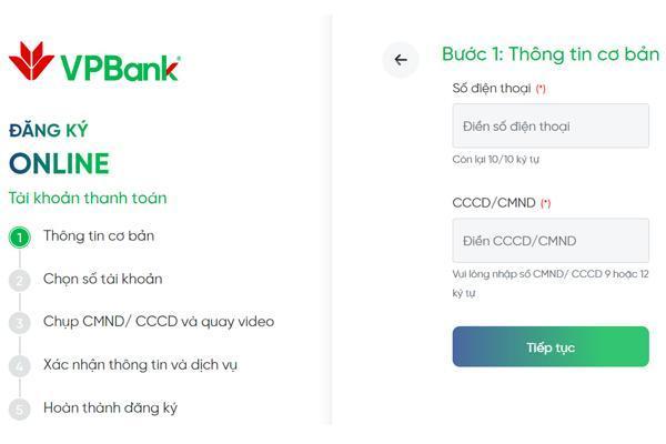 Bước 1: Truy cập website https://taikhoan.vpbank.com.vn/ và chọn Đăng ký ngay. Điền thông tin cơ bản: Số điện thoại (10 số), Số CCCD/ CMND, chọn Tiếp tục.