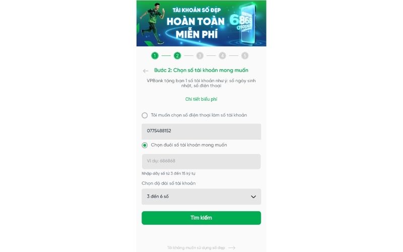 Bước 2: Chọn số tài khoản theo số điện thoại, đuôi số tài khoản mong muốn. Bạn có thể chọn số đẹp theo mong muốn của mình. Lưu ý, sử dụng tài khoản số đẹp có thể bạn cần thanh toán thêm một khoản phí nhỏ hoặc nhận tài khoản số đẹp miễn phí theo chương trình hỗ trợ của VPBank.