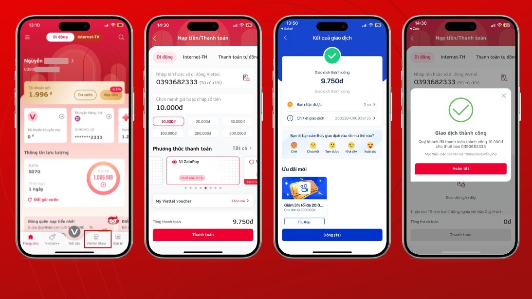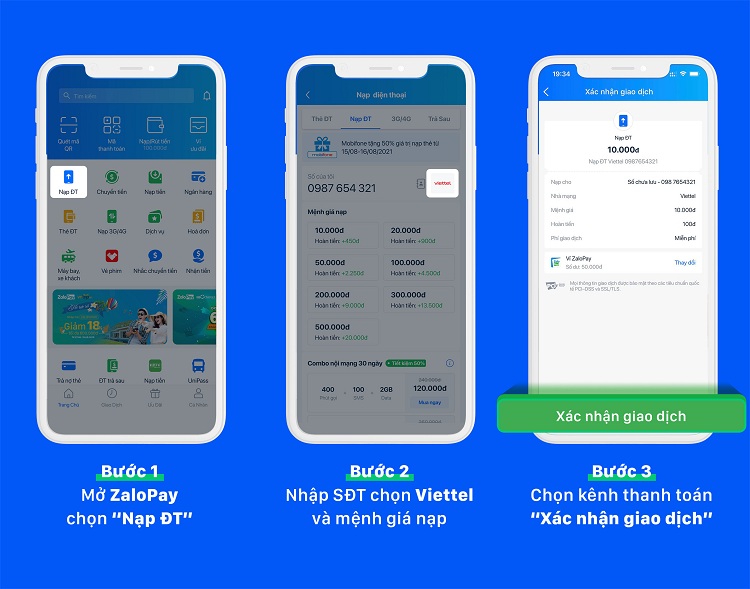 Bước 5 - Xác nhận và hoàn tất giao dịch: Kiểm tra kỹ lại thông tin, sau đó xác nhận thanh toán. Giao dịch được xử lý trong vài giây và điện thoại sẽ được nạp tiền ngay lập tức.