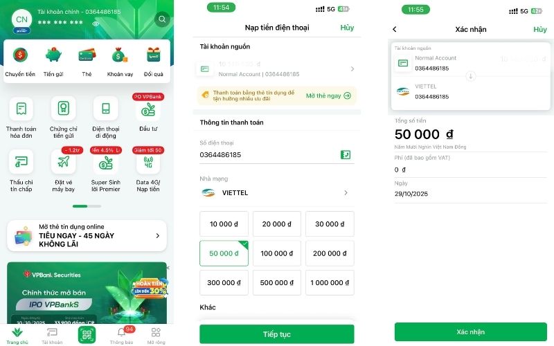 Nạp tiền điện thoại online qua ứng dụng VPBank NEO