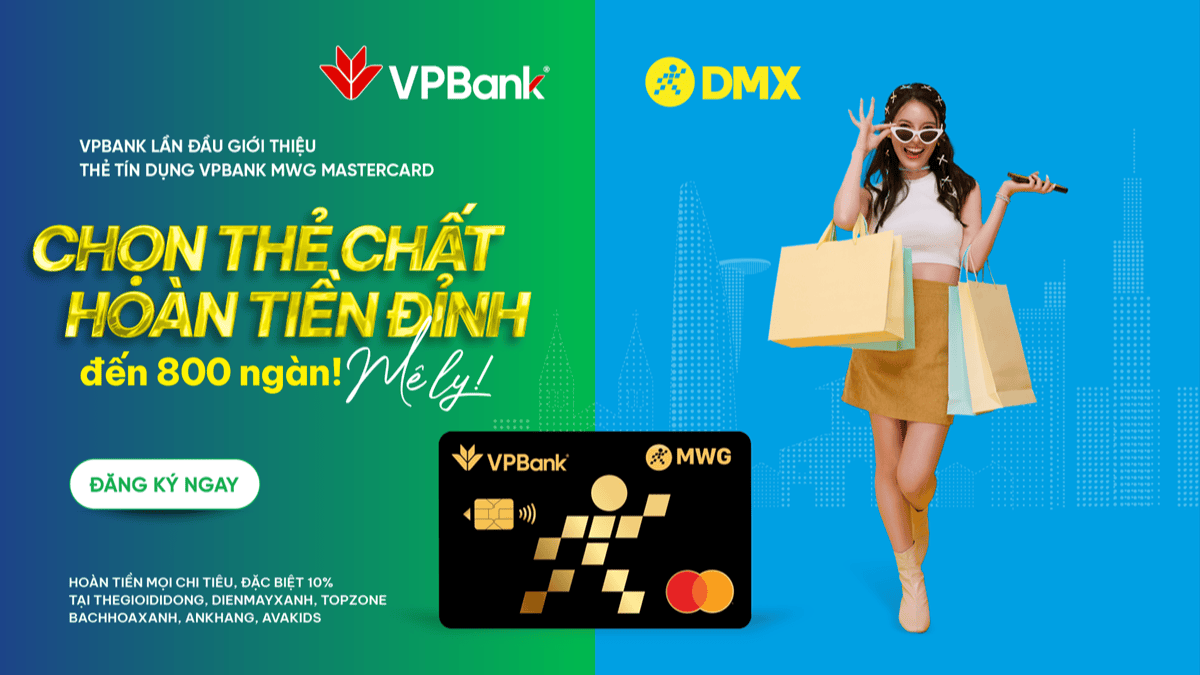Ngân hàng TMCP Việt Nam Thịnh Vượng (VPBank) và Công ty Cổ phần Đầu tư Điện Máy Xanh (DMX) vừa chính thức ra mắt thẻ tín dụng VPBank MWG Mastercard - dòng thẻ tín dụng chuyên biệt cho lĩnh vực bán lẻ điện tử và tiêu dùng lần đầu tiên xuất hiện trên thị trường Việt Nam. Với khẩu hiệu “Quẹt thẻ đi! Thật mê ly”, VPBank và DMX muốn truyền đi một thông điệp đầy cảm hứng cho lối sống thời thượng đầy phong cách của cộng đồng ngày nay. Mỗi lần dùng tấm thẻ là ngay lập tức nhận được ưu đãi, thông điệp “Bật năng lượng, sạc niềm vui” chính là năng lượng tích cực mà tấm thẻ mang tới khi đồng hành cùng khách hàng.