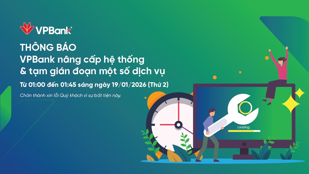 VPBank thông báo: Tạm gián đoạn dịch vụ trong thời gian nâng cấp hệ thống (Sáng ngày 19/01/2026)